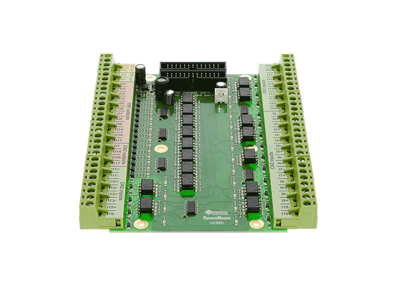 Features: - 2x IDC26 ports with LPT port pinout. One standard LPT port and one input type LPT port. - 16 outputs and 18 inputs. - All I/Os optical isolated with high speed 10Mbit/sec optocouplers. - Open-drain Mosfet outputs for external relay control. - Pluggable screw terminals. - LED indicators on all I/Os. - 24V capable I/Os.